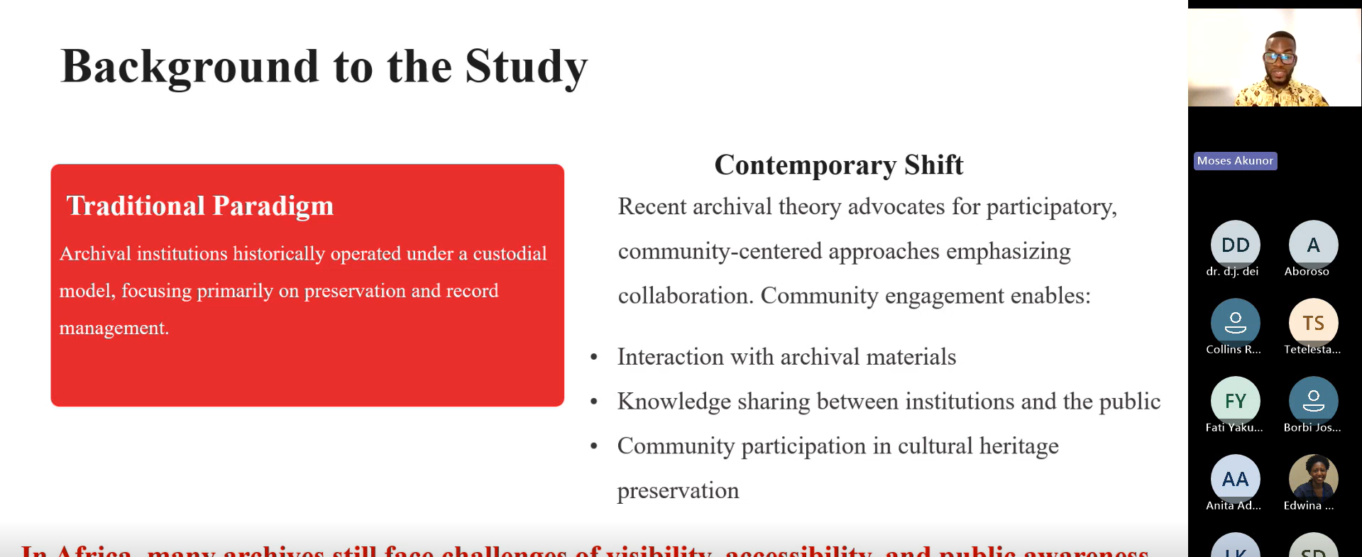 تناولت محاضرته، بعنوان “الدِّفاع عن الأرشيف: استكشاف المشاركة المجتمعية في أرشيف ج. هـ. كوابينا نكيتيا”، كيفية تفاعل الأرشيف التَّابع لمعهد الدِّراسات الإفريقية مع مجتمعه في صون التُّراث الثَّقافي والتَّرويج له. وباستخدام نموذج “استمرارية إشراك المجتمع” كإطار عمل، استكشفت الدِّراسة مستويات الوعي والإدراك والمشاركة، مع تحديد العوائق الرَّئيسية، مثل محدودية الظهور، وضعف جهود التواصل. وتدعو الدِّراسة إلى التَّحول من الحفظ السِّلبي إلى تبنَّي استراتيجيات تتمحور حول المشاركة المجتمعية الفعَّالة.