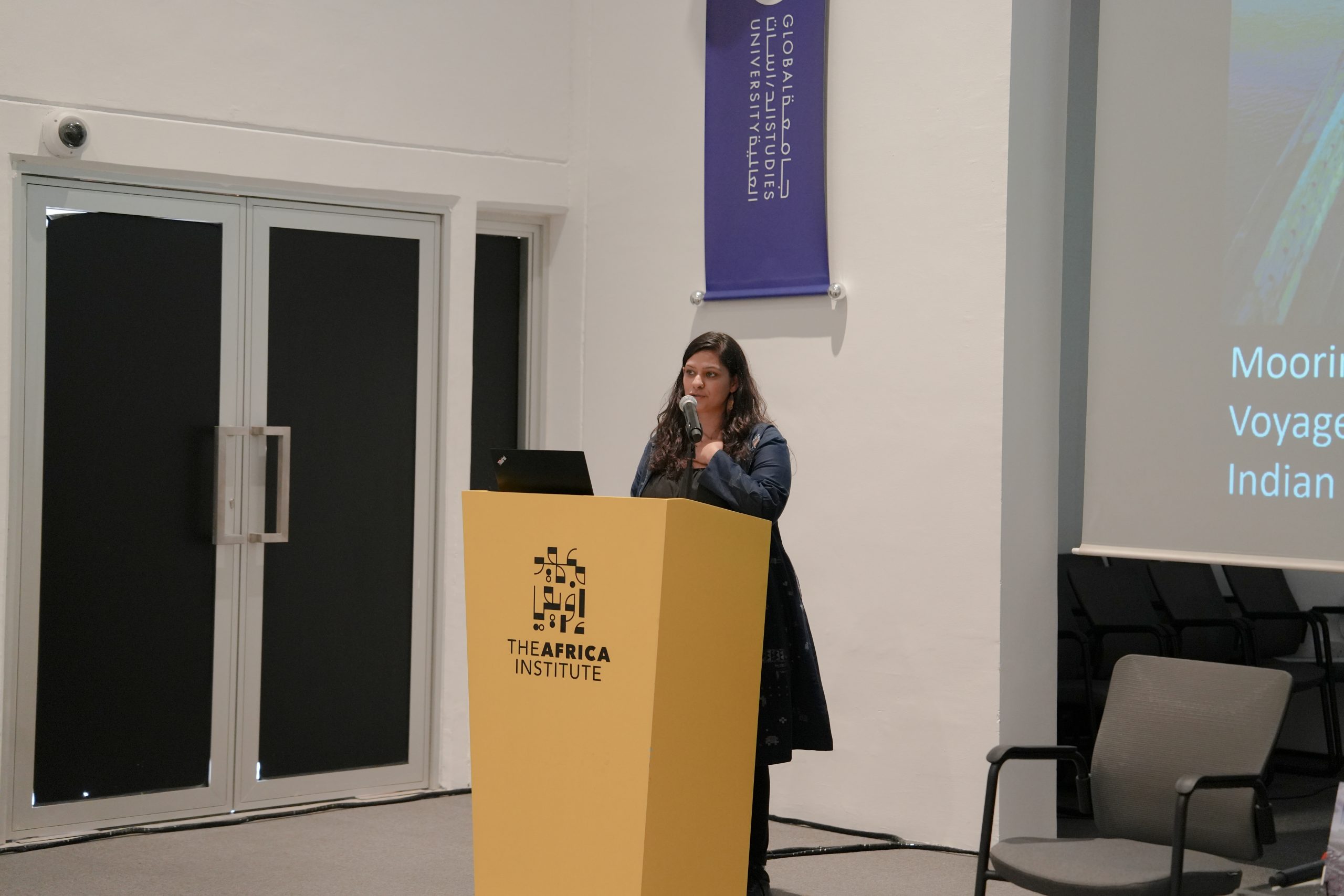 Nidhi Mahajan is Associate Professor of Anthropology at the University of California–Santa Cruz. She was the inaugural Fatema Mernissi Postdoctoral Fellow in Social and Cultural Studies (2020–2022) at The Africa Institute. Her research focuses on political economy, maritime labor, and historical, political, and legal anthropology, with a regional focus on the Indian Ocean world. She earned her Ph.D. in Anthropology from Cornell University. Her first book, Moorings: Voyages of Capital across the Indian Ocean (University of California Press, 2025), was developed during her residency at The Africa Institute. Her articles and essays have appeared in journals such as History of the Present; Comparative Studies of South Asia, Africa and the Middle East; Monsoon; Island Studies; Cambridge History of Global Migrations; Reimagining Indian Ocean Worlds; Cosmopolitan Cultures and Oceanic Thought; and World on the Horizon, and she has also written for Ajam Media Collective, Compare Afrique, Cityscapes, and Middle East Report. As an artist, she has produced multimedia exhibitions exploring seafaring, labor, and oceanic histories, shown internationally at venues including the Sharjah Architecture Triennial, Khoj (Delhi), Alliance Française (Nairobi), Macondo Literature Festival (Nairobi), Diriyah Biennale (2024), and Hayy Jameel (Saudi Arabia). She has also written ethnographic fiction on seafaring and climate change for the World Weather Network.